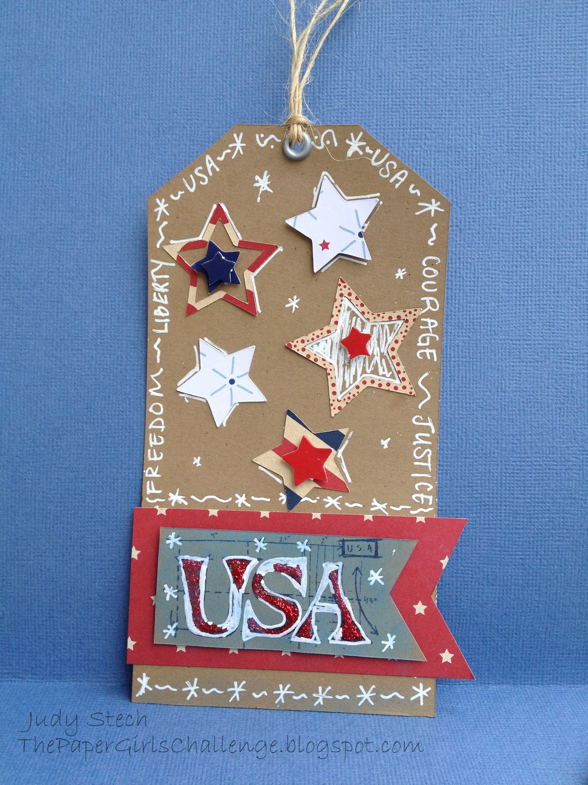 Judy created this fun patriotic tag with fun doodling around the edge, coloring in some of the stars and highlighting the USA.