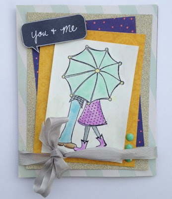 On this first one I used an umbrella and rain with one of my favorite stamps. I wanted the couple to be black and white with the umbrella just popping with color.